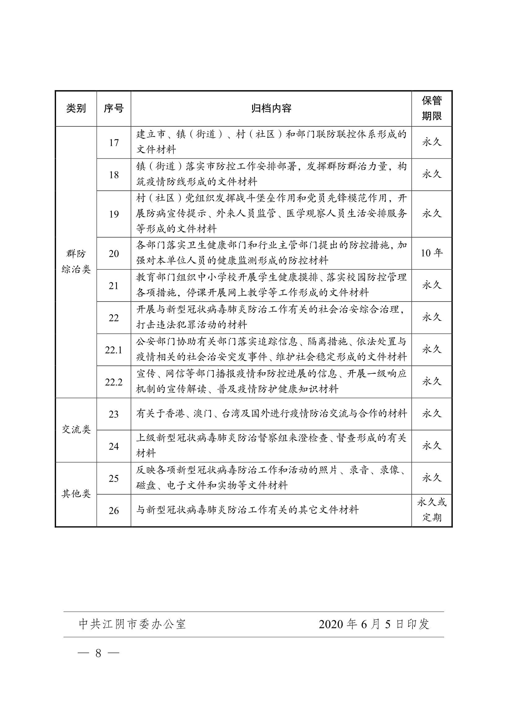 当前和今后一个时期,各部门及市、镇街园区疫情防控指挥部要指定专人、明确职责,做好纸质、照片、音像、实物、电子文件等各种文件材料的收集整理归档。要采取扎实措施,确保涵盖政策文件、疫情流调、督查、院感、药物疫苗科研、防控新闻和科普宣传、病人收治、诊疗、应急心理干预、重点场所和人员防控、企业学校防控、乡村社区摸排和联防群防、交通运输和生活物资保障、农产品生产与安全、返工返学、经济运行等方面抗疫防疫全过程材料齐全完整归档。要有针对性收集江阴医疗队典型人物和先进集体事迹材料,“为英雄建档、为英雄留名”,为所有援鄂医护人员留下珍贵的逆行记录。要注意收集疫情防控方面的原创歌曲、微视频、音乐电视、美术、诗歌、曲艺等优秀作品;基层的硬核喊话、标语口号、快板顺口溜、日记;具有典型代表意义的实物,如防护用具、誓师横幅、医疗队队旗等。要注重收集应归档原生电子文件等,做到应收尽收、应归尽归。文件材料归档内容及分类请参考附件。