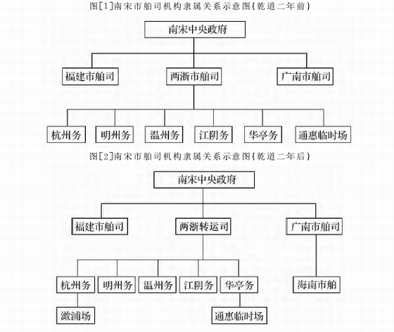 北宋市舶制度经过不断演变,至宋徽宗年间确立了广南路市舶司(又称广州市舶司)、福建路市舶司(又称泉州市舶司)和两浙路市舶司三路市舶司的体制。这三路市舶司的管辖范围正好覆盖了从长江口到北部湾(包括海南岛)的万里海疆。市舶司的下属机构是市舶务。南宋绍兴三年,两浙路市舶司分别在临安府(也就是北宋时的杭州)、明州、温州以及秀州的华亭县设四处市舶务。